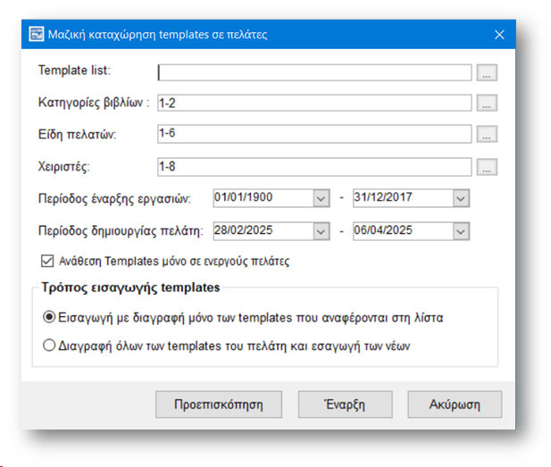 Έως: η νεότερη.7. Ανάθεση μόνο σε ενεργούς πελάτεςΤσεκάρετε την επιλογή αν επιθυμείτε να γίνει καταχώρηση μόνο σε πελάτες που είναι ενεργοί.8. Τρόπος εισαγωγής templates (επιλογή με radio buttons)Επιλέξτε τον τρόπο με τον οποίο θα εφαρμοστούν τα templates στους πελάτες: