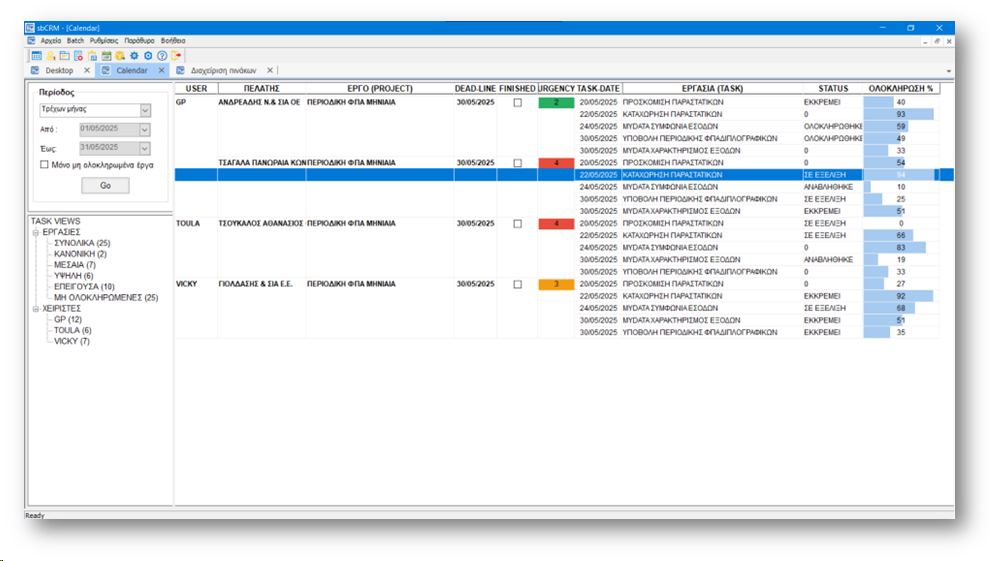 Η ενότητα Ημερολόγιο του sbCRM αποτελεί το βασικό εργαλείο για την παρακολούθηση, ενημέρωση και διαχείριση των εργασιών (tasks) που έχουν ανατεθεί σε πελάτες, στο πλαίσιο συγκεκριμένων έργων και περιόδων.