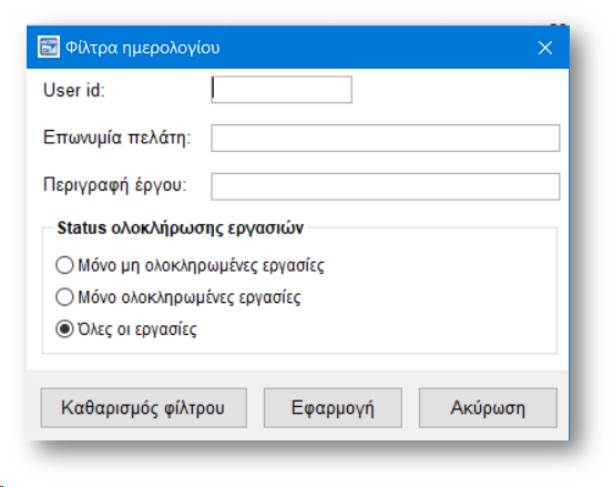 Καθαρισμός φίλτρου: Διαγράφει όλες τις τιμές φίλτρων και επαναφέρει την πλήρη λίστα εργασιών.